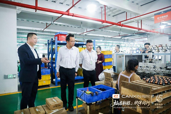 镇党委书记邹小龙亲临灿欣电器新总部,深入办公区、生产车间、产品展厅和研发中心调研,详细了解企业发展历程、产品研发、市场布局及未来规划。他对灿欣电器长期扎根东凤、专注实业、持续创新取得的成效给予充分肯定,并赞扬了企业及邹传雷总经理热心公益、履行社会责任、支持地方发展的担当与贡献。
