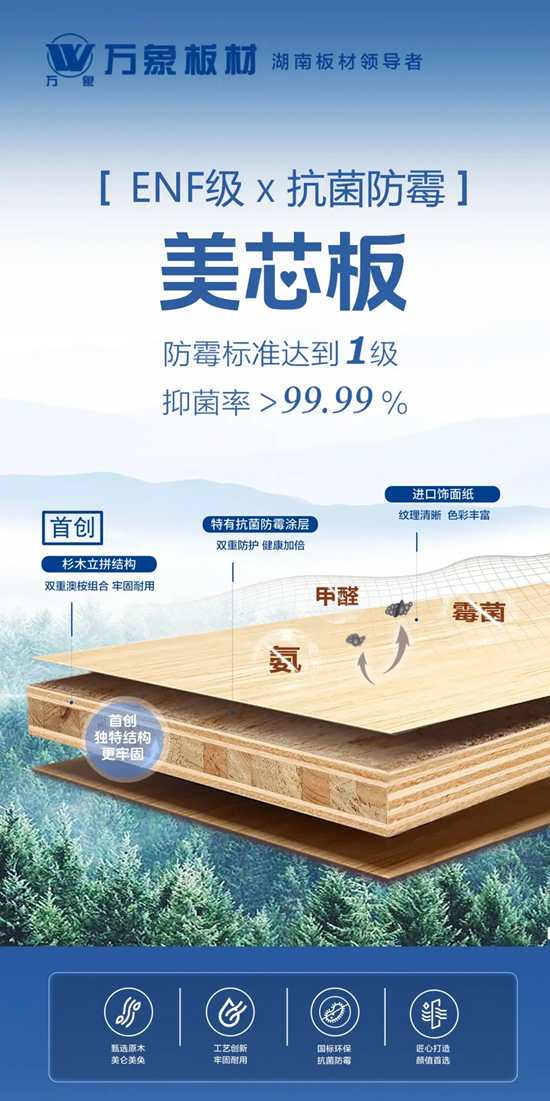 美芯板具有强效抗菌能力和防霉效果,对金黄色葡萄球菌、大肠杆菌等具有强效抗菌能力,抑菌率>99.99%,且经10年老化和洗刷试验后,抑菌率仍能达到90%以上。