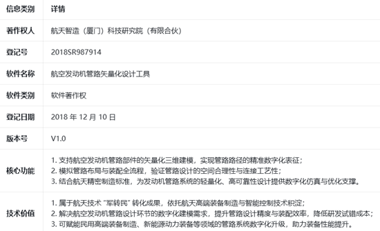航天智造(厦门)科技研究院并购航空发动机管路矢量化工具软著