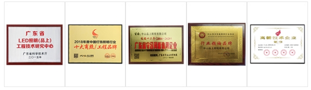 品上照明以其前瞻性的市场思维、深入的照明研发与探索,以及优质的服务,赢得了社会和市场的广泛认可,于2009、2015年分别被认定为“市级企业技术中心”,“广东省LED照明工程技术研究中心”,由广东卓越质量品牌研究院授予了“广东省名牌产品(2014-2018)”、被广东省工商行政管理局评为“广东省守合同重信用企业(2008-2020)”,并多次获得“广东省高新技术企业”称号等众多殊荣。