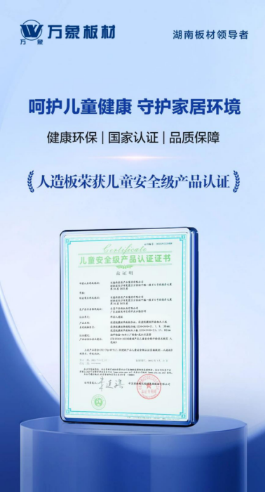 秉持行业领军者的责任与环保先锋的使命,万象板材紧密锚定国家战略方向,深度挖掘消费市场对安全居住环境的迫切需求。儿童安全级产品认证,以更严苛的环保标准、更严谨的认证规则,旨为保障儿童活动场所质量及环境安全健康,也为践行国家质量强国战略、保证儿童健康生活贡献力量。