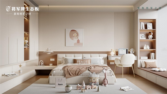 将军牌生态板的浅原木纹理,是儿童房空间的灵魂所在,搭配清爽通透的白色柜体,两种色调碰撞出治愈感满满的视觉体验,既不沉闷也不单薄,让儿童房始终保持明亮开阔的质感;当阳光透过窗帘洒入时,原木色书桌、衣柜泛出柔和暖光,白色面板折射出细碎光影,在墙面与地面形成灵动光斑,孩子追逐光斑嬉戏、趴在书桌涂鸦,光影与木色交织的瞬间,便是童年珍贵的画面,这种低饱和配色契合儿童房清新调性,更能适配孩子成长过程中的软装变化,多年后依然不会过时。