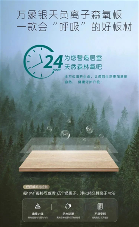 时光凝练经典品质,眼界成就家装艺术,24年潜心钻研家居木制品行业,成就环保美观的经典板材,万象银天负离子森氧板,会呼吸的好板材。
