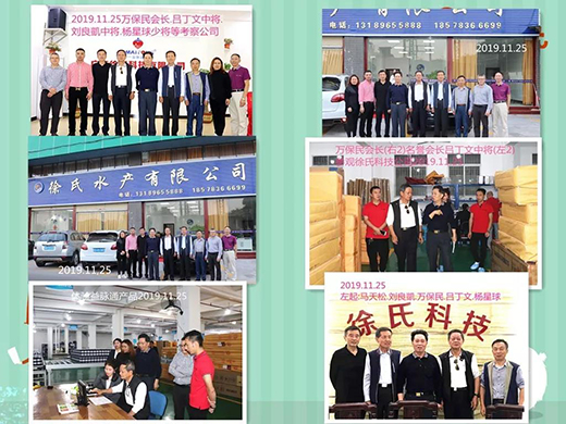 2019年11月25日,广东省红色旅游文化促进会会长万保民、名誉会长吕丁文中将和刘良凱中将、顾问杨星球少将和马天松、秘书长李兴辉等领导莅临广东徐氏科技有限公司以及广东徐氏水产有限公司考察指导。