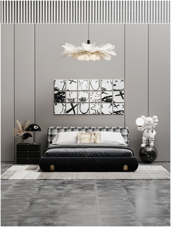 一张洛品有家卡萨系列软体床,搭配色调一致的床头柜,勾勒卧室的艺术感。充满意式简奢风格的黑色线条释放出无拘无束、放松舒适的态度,让原本的空间不再单调。