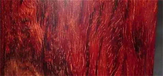 2、纹理:木材表面特征接近小叶紫檀,但纹理相对较粗,且牛毛纹偏长、偏多、偏直,打磨后有明显木线,即棕眼出现。