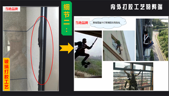 这种叫中空玻璃室外打胶工艺。看图片其实不难发现,整体做工粗糙且不美观,同时安装也十分不专业。由于门窗的安装需要人为高空作业,室外打胶更难把控质量。而这种室外打胶工艺所造成的的一些细节上的失误会导致后续使用中出现一系列问题,比如胶没打好,正常使用后,长期的阳光紫外线暴晒和酸雨冲刷会导致胶老化,最后会脱落漏水。那一到下雨天,就会变成外面下大雨,家里下小雨的尴尬局面,严重影响我们的日常生活。除此之外,室外打胶还会存在一定的安全隐患。特别是楼层不高的家庭,小偷可以直接用刀片把室外的胶刮掉,直接取下玻璃,进行盗窃,那对我们的生命财产安全存在巨大的威胁。同时,高空室外打胶非常危险。以上,就是室外打胶工艺的弊端。