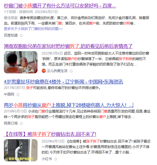 不知道大家有没有遇到过,小朋友抓着家里的平开窗开启扇的纱网网上抽会把纱网卸出来。这类新闻在百度上一搜真是比比皆是。这是一个见惯不怪存在极大安全隐患的纱网工艺问题,也是我们需要讲述的第三个细节。
