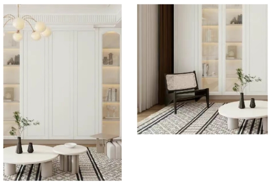 聚焦空间利用率,采用内嵌式设计与顶天立地定制柜体相结合的方式,巧妙将收纳空间嵌入非承重墙等传统闲置死角,既避免了柜体突兀摆放造成的空间割裂,又最大化减少浪费,让收纳与空间布局融为一体。