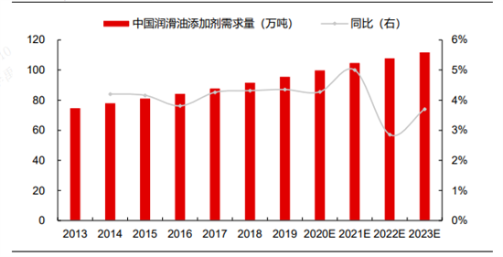 得益于中国机动车保有量的不断增长,我国润滑油添加剂需求量稳步提升。我国润滑油 添加剂的需求量由 2013 年的 75.0 万吨增长到 2019 年的 95.9 万吨,年均复合增长率 为 4.2%。随着我国机动车市场的持续增长及工业化进程加快,预计国内润滑油添加剂市场的需求将继续保持较高的增长率。据上海市润滑油品行业协会的预测,至 2023 年, 我国润滑油添加剂需求量有望增长至 112.0 万吨。