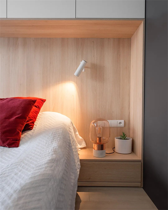主卧作为休息的场所,⾊温要选择偏暖色调。最好用台灯、壁灯、筒灯来提供局部照明,光源一定要柔和,才有助于夜晚睡眠。